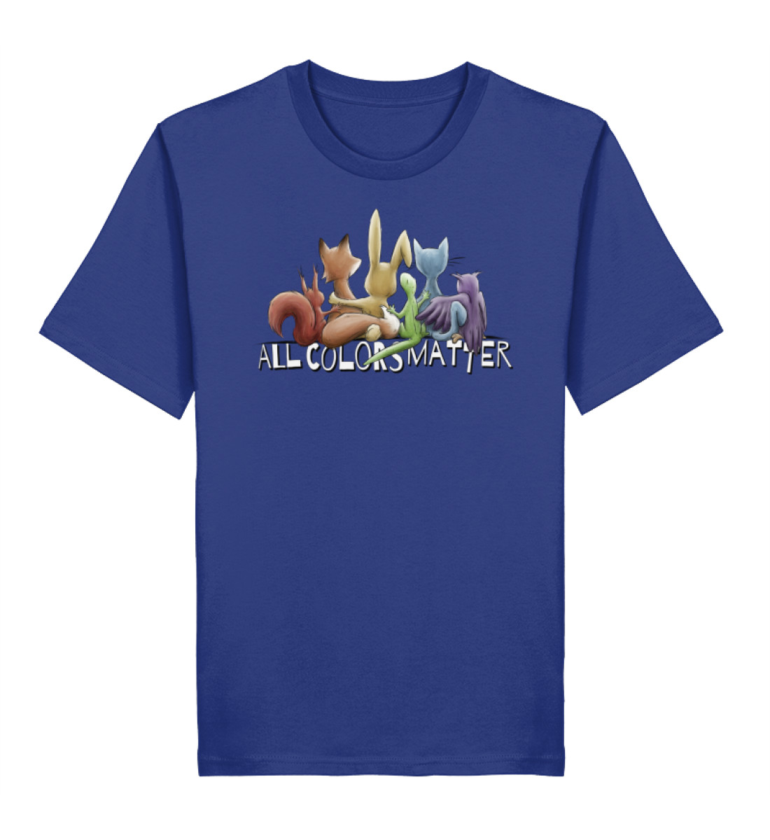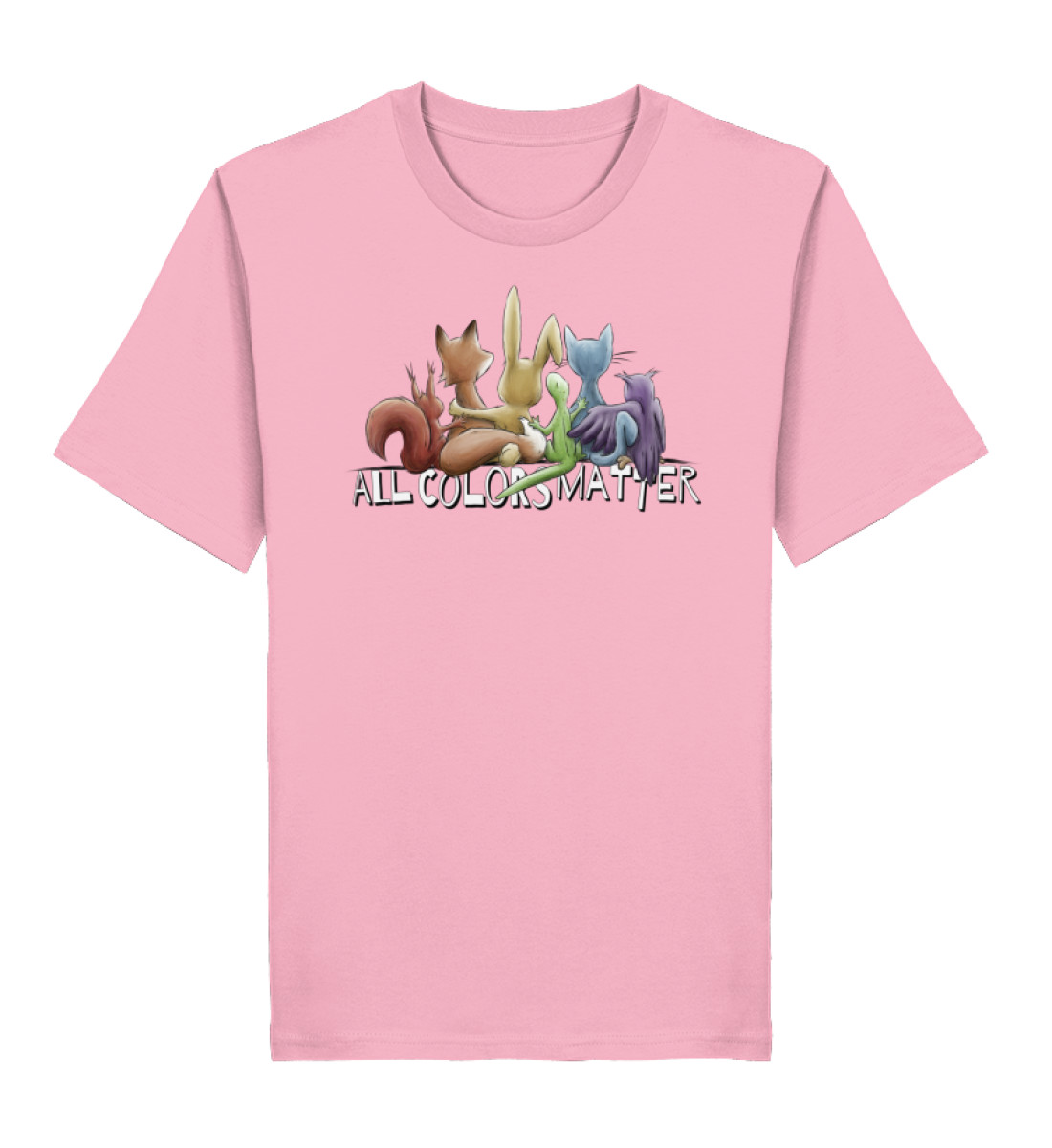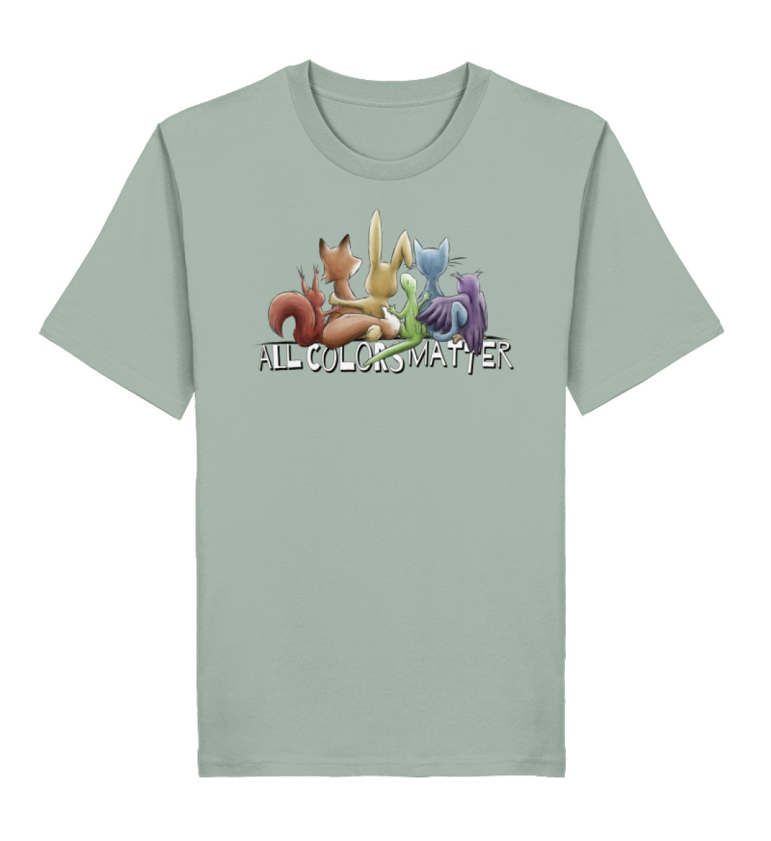 Das Motiv zeigt fünf Tiere, Eichhörnchen, Fuchs, Hase, Gecko, Katze und Eule in Regenbogen-Farben, gemeinsam für ein menschliches Miteinander, für Vielfalt, Respekt, Toleranz und Leben!