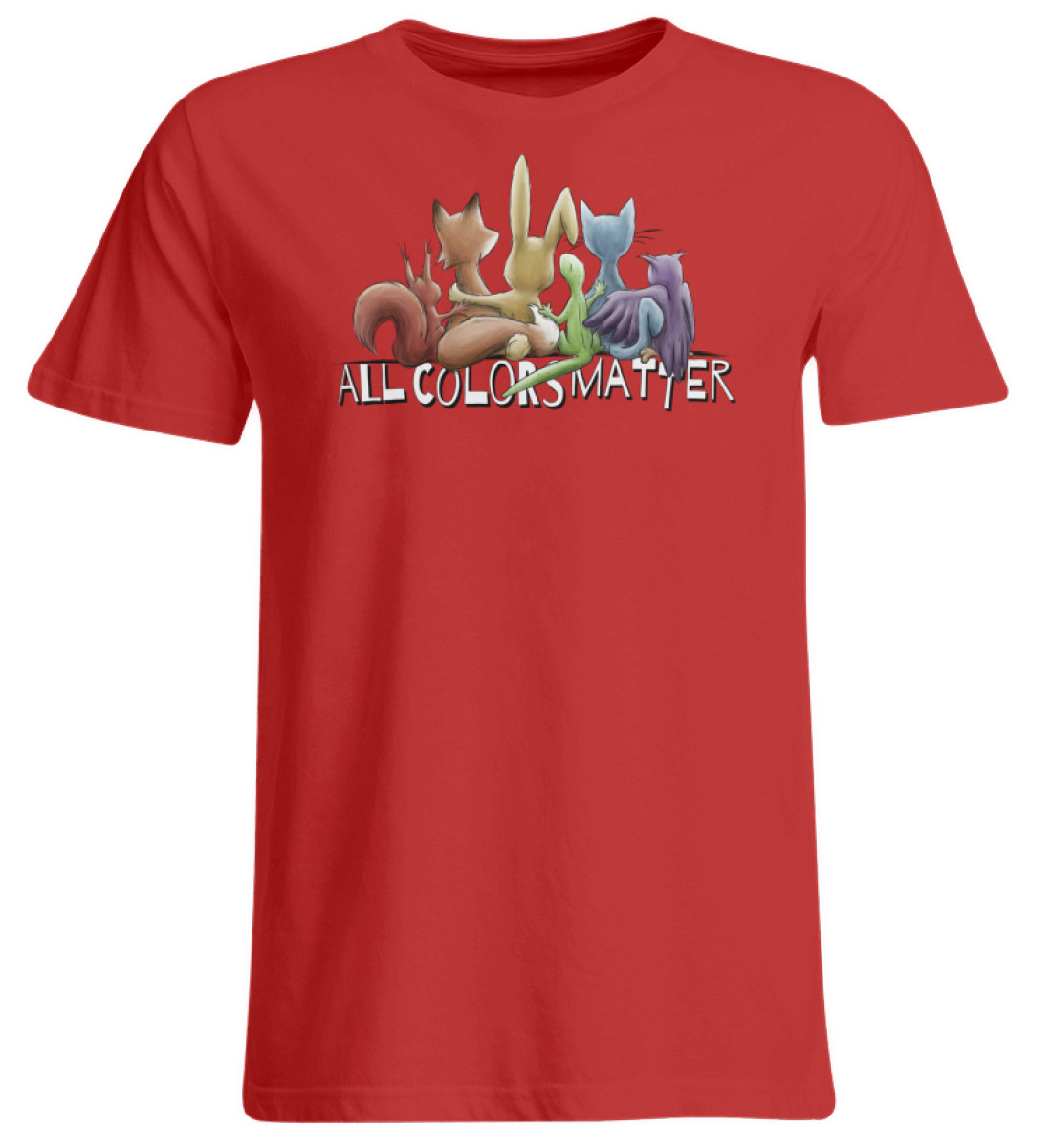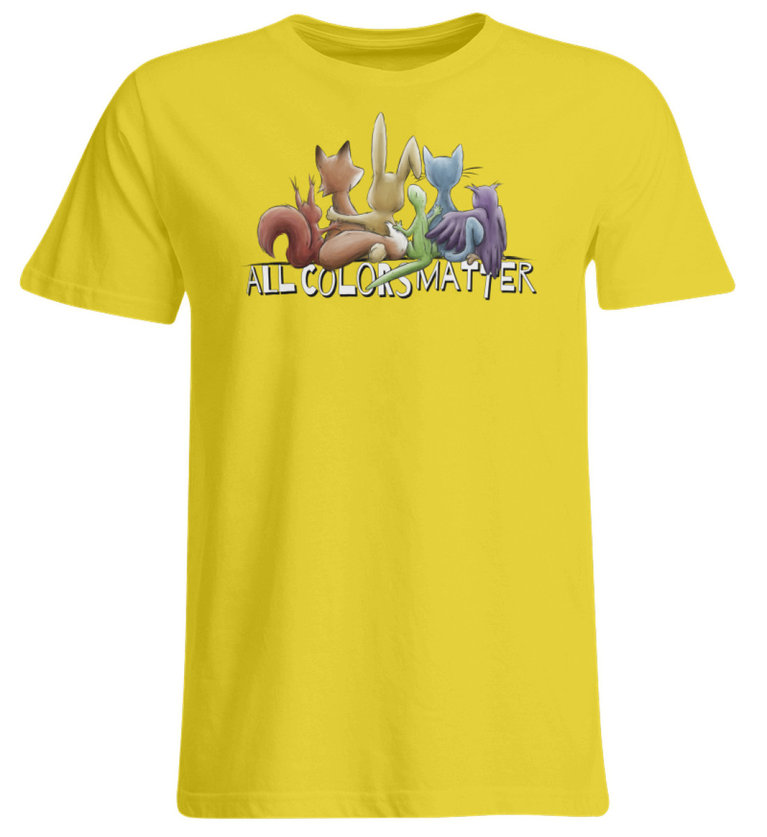 Das Motiv zeigt fünf Tiere, Eichhörnchen, Fuchs, Hase, Gecko, Katze und Eule in Regenbogen-Farben, gemeinsam für ein menschliches Miteinander, für Vielfalt, Respekt, Toleranz und Leben!