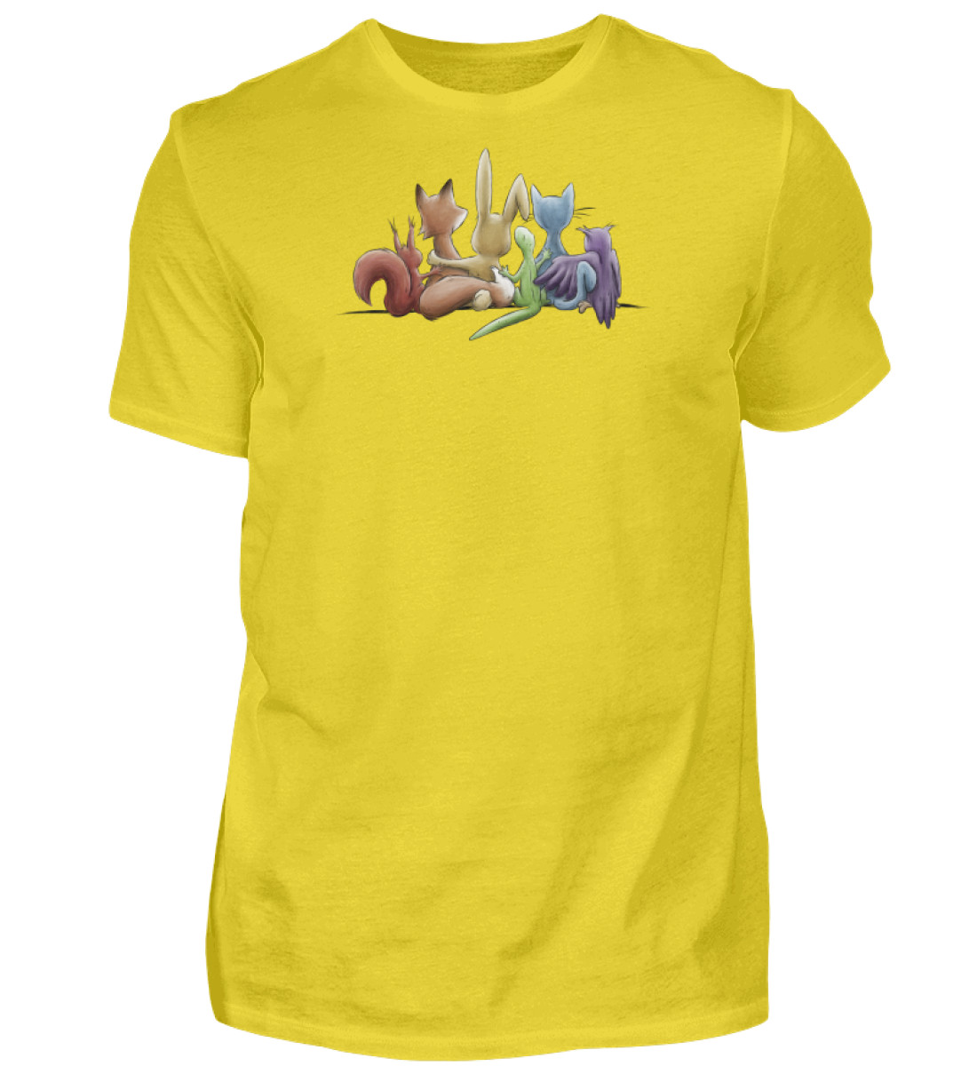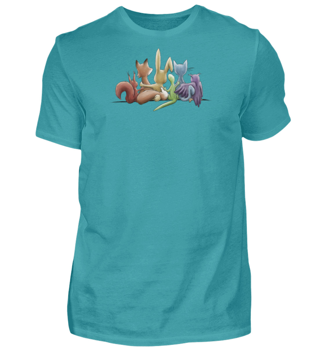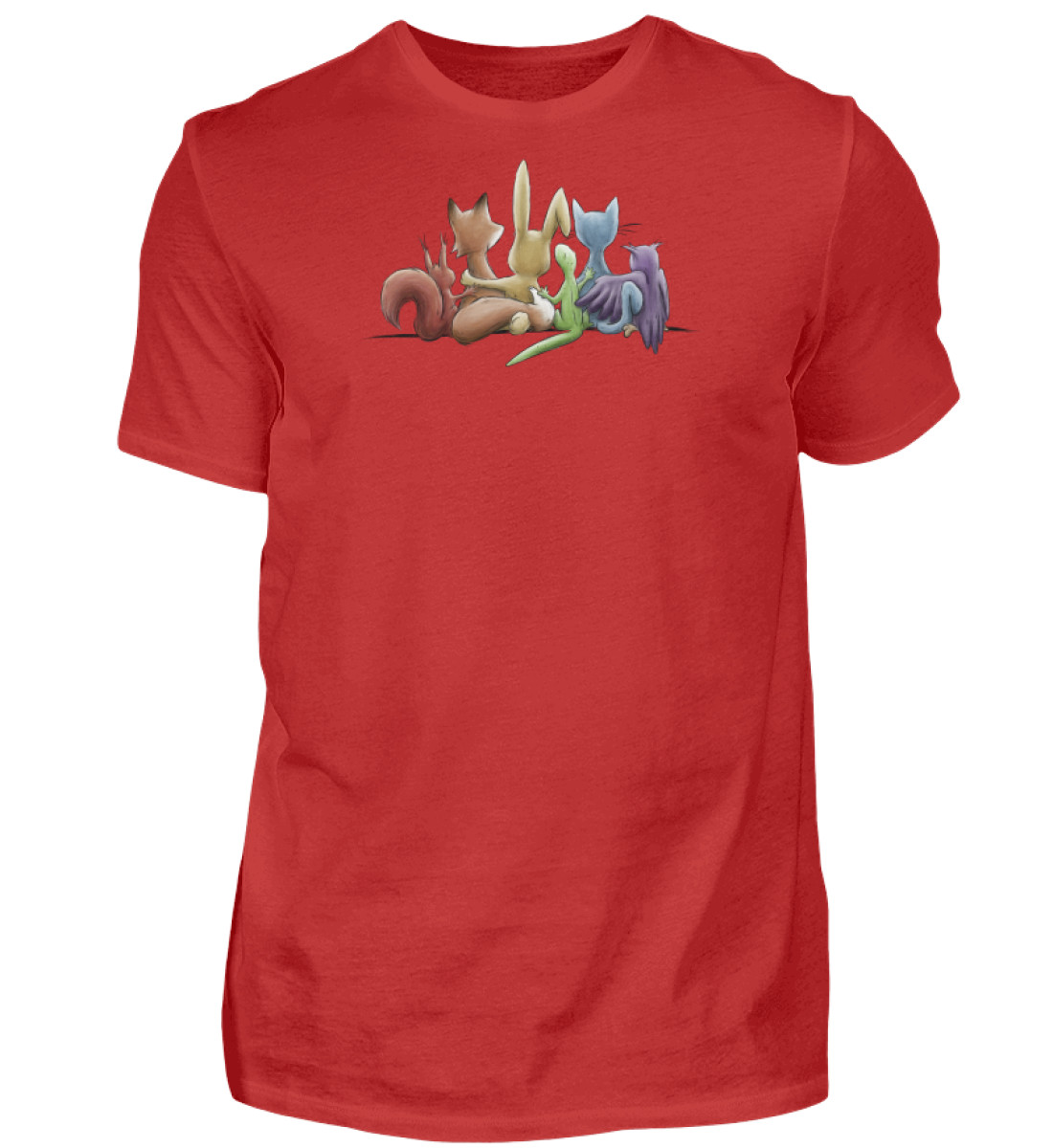Das Motiv zeigt 5 Tiere, Eichhörnchen, Fuchs, Hase, Gecko, Katze und Eule in Regenbogen-Farben, Arm in Arm gemeinsam für ein menschliches Miteinander, für Vielfalt, Respekt, Toleranz und Leben!