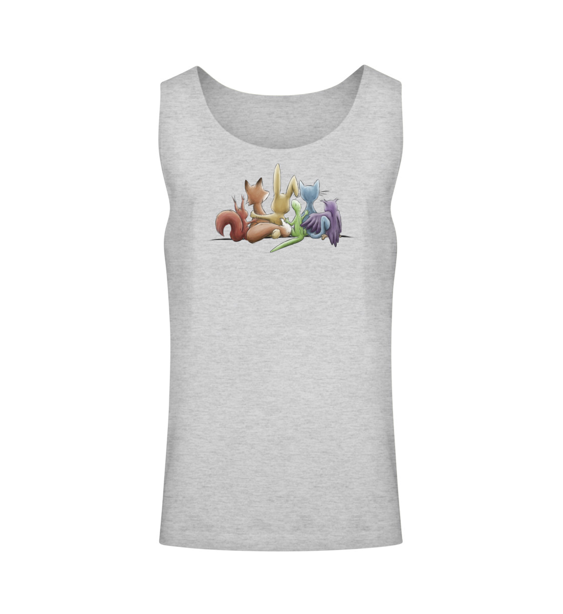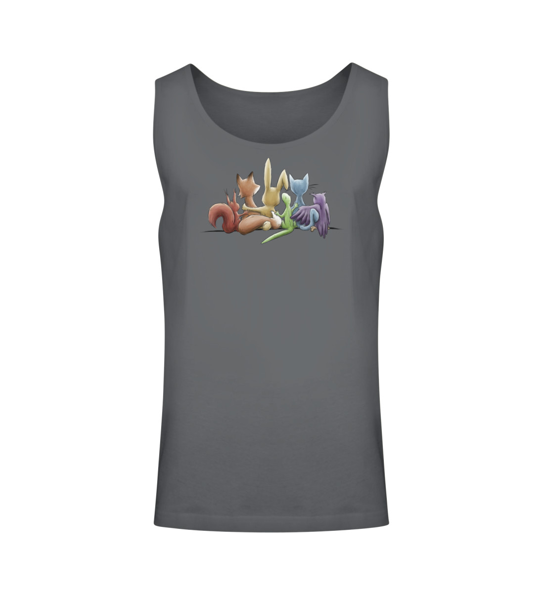 Das Motiv zeigt 5 Tiere, Eichhörnchen, Fuchs, Hase, Gecko, Katze und Eule in Regenbogen-Farben, Arm in Arm gemeinsam für ein menschliches Miteinander, für Vielfalt, Respekt, Toleranz und Leben!